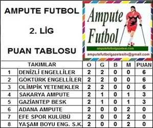 EFE AMPUTE’nin GAZİANTEP BESK müsabakasına çıkmamasından dolayı hükmen 3-0 yenik sayıldığı 2. Lig 2. hafta sonunda oynanan maç sonuçları ve puan durumu;