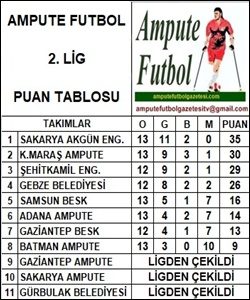 Gebze Belediyesi Ampute’nin BAY geçtiği, Adana Ampute, Batman Ampute ve Şhitkamil Engelliler’in hükmen galip sayıldığı 2. Lig 14. haftasında oynananmaçların sonuçları ve puan tablosu.