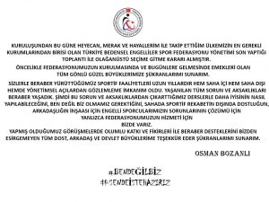 Sizlerle beraber yürüttüğümüz sportif faaliyetleri uzun yıllardır hem saha içi hem saha dışı hem de yönetimsel açılardan gözlemleme imkanım oldu. Yaşanılan tüm sorun ve aksaklıkları beraber yaşadık. Şimdi bu sorun ve aksaklıklardan çıkarttığımız derslerle daha iyisinin nasıl yapılabileceğini, ben değil biz olmamız gerektiğini, sahada sportif rekabetin dışında dostluğun, arkadaşlığın inşaası için, engelli sporcularımızın sorunlarının çözümü için yanlızca federasyonumuzun hizmeti için bizde varız.